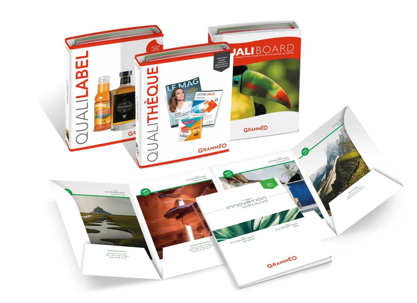 Un book d’échantillons (blancs ou imprimés) dédié à chacune de nos gammes pour vous aider à identifier la qualité de papier, carton ou étiquette la plus adaptée à votre projet.